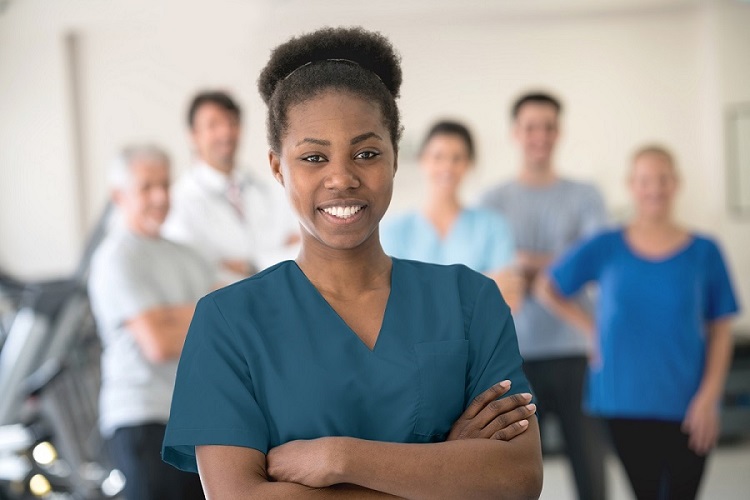 Portrait of african american physiotherapist at the clinic looking at the camera smiling with arms crossed and patients and team standing at the background – Focus on foreground